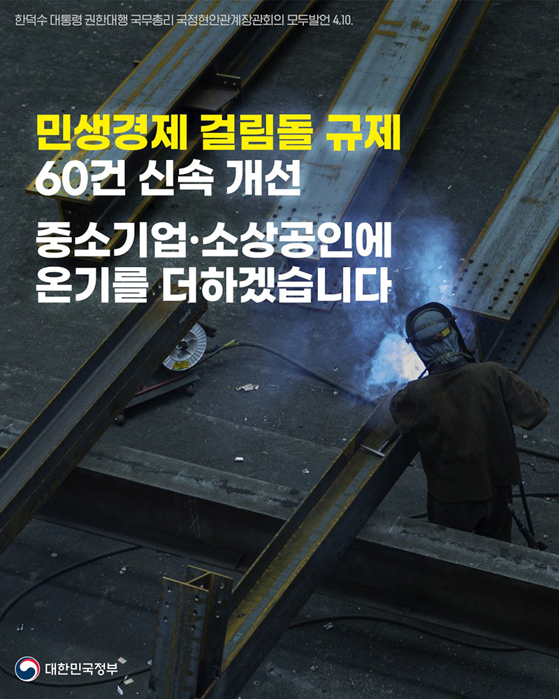 정부는 중소기업·소상공인의 부담을 줄이고 민생경제를 회복하기 위해 권역간 외국인근로자 이동 허용, 중급 기술자 자격 완화, 창업기업 수의계약 한도 확대 등 규제 60건을 상반기 내 개선한다. 산업별·업종별 맞춤형 개혁으로 현장 체감도를 높이고, 행정 효율과 경제 활력을 동시에 꾀한다.